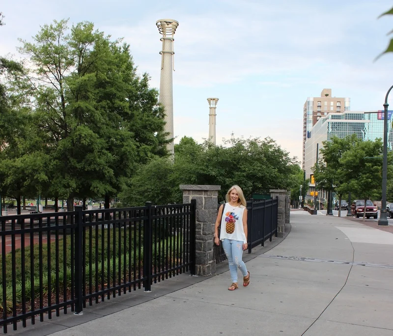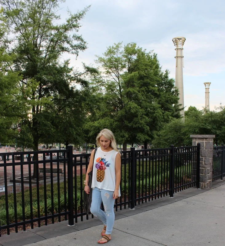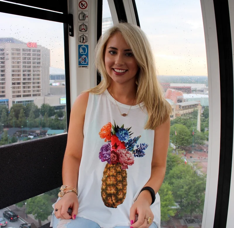 Hey y'all! Yesterday, I was in Atlanta on a buying trip for Rolling Runway at America's Mart. After a long, stressful but fun day we decided to walk to SkyView Atlanta to avoid rush hour traffic back to Athens and relax a little. I have been wanting to go to SkyView since it first opened and it was gorgeous seeing Atlanta from that view. Make sure to bring your student ID for a discount or there is a groupon for 2 tickets & chocolate that we regretted not purchasing after seeing the Russel Stovers box in the ticket booth. Maybe next time. I purchased this Show Me Your MuMu tank last week (on instagram) from a boutique in Atlanta last week and it was perfect for mart. It's so soft and flowy and perfect for when you want to be comfortable but still cute. The jeans I bought on recommendation from my BFF from target and the shoes are my summer staple flip flops from Francesca's. My feet didn't even hurt until the end of the day after we had already walked 10,000 steps. My bag I actually purchased at the mart in October from Golden Stella...if you ever get to go to the mart you have to go there to see the craziness and the insane amount of jewelry and accessories they have. Atlanta was so fun yesterday but today I am exhausted! Stay tuned to see all the cute things we purchased at mart!
